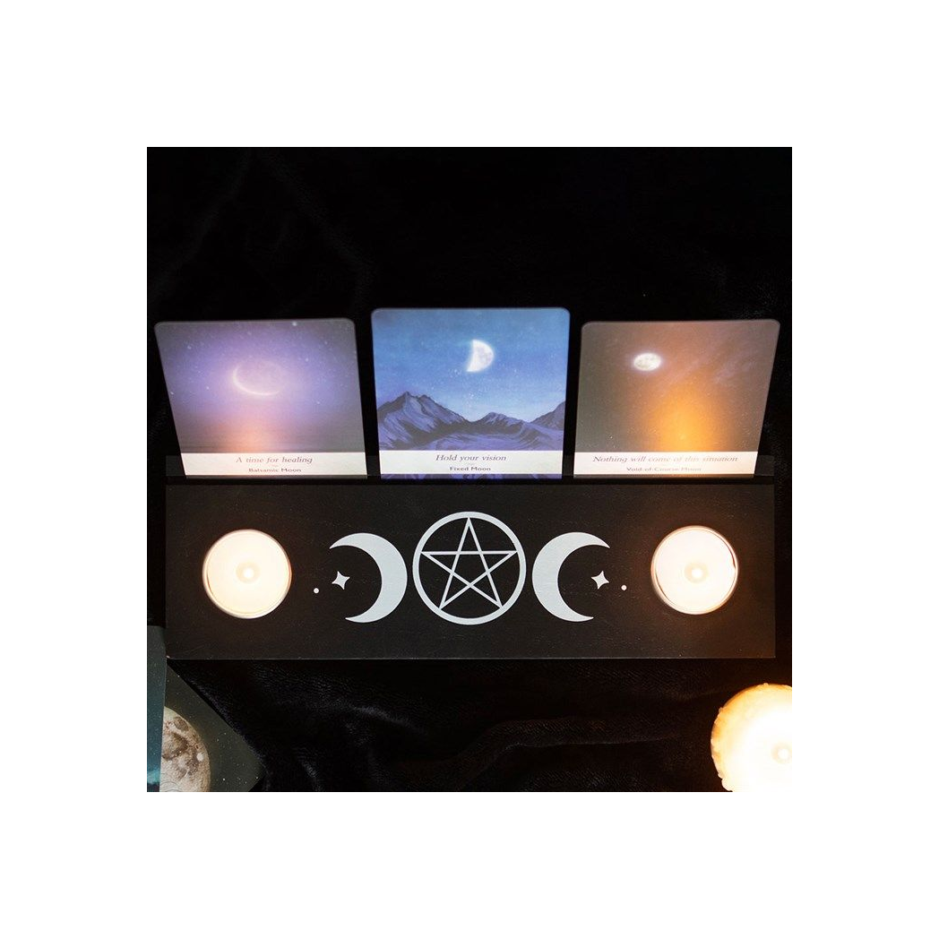 Display tarot card readings with this black wooden triple moon tarot card stand, complete with two spaces for holding tealight candles to create ambiance and allow the meaning of the cards to resonate. Whether it's used for displaying treasured tarot cards for their meaning or their unique design, this piece will add mystical allure to any home.