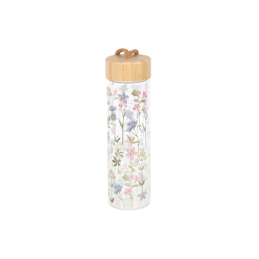 Stay hydrated with this stylish glass water bottle with a pretty floral design in delicate pastel shades of blue, pink, yellow and green. A practical and thoughtful gift idea for any occasion. Features a bamboo lid and loop for easy carrying. 600ml. Not suitable for microwave use. Handwash only.