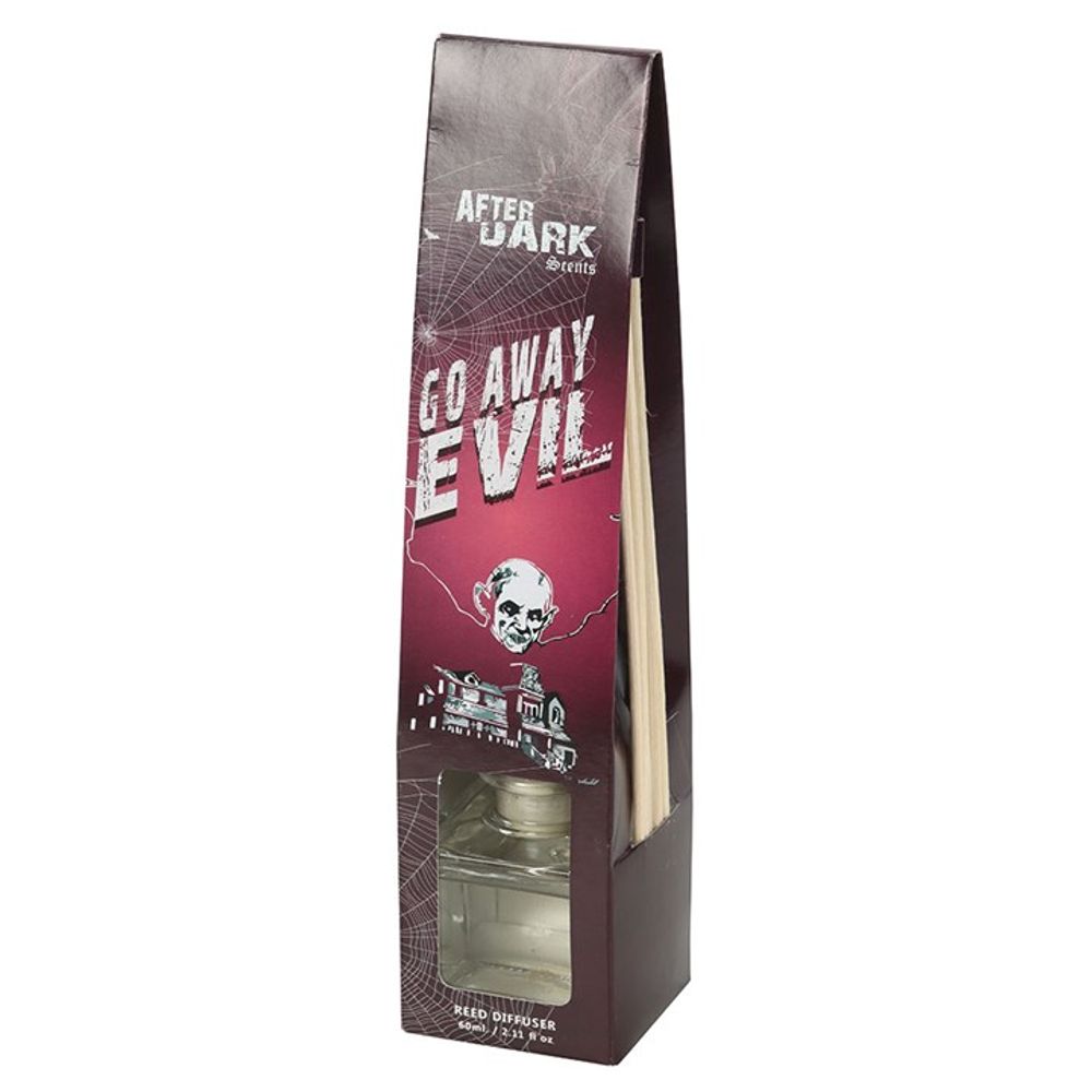 Ward off unwanted spirits with this Go Away Evil reed diffuser. This set includes 60ml of rose fragrance oil for keeping demons at bay and is perfect for adding a touch of excitement to your favourite dark hideaway. Do not ingest. Keep oil away from eyes, skin, furniture and painted surfaces. Part of the After Dark collection of gothic home fragrance accessories.