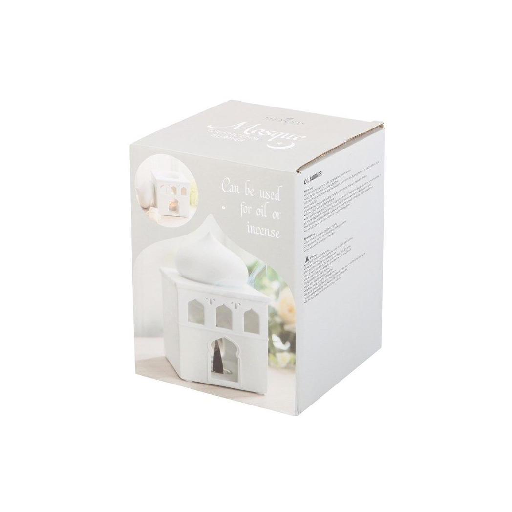 This beautiful glossy, off-white mosque oil burner has been carefully crafted to offer a lit-from-within glow as the windows and door are illuminated by candle light. To use simply place a lit tealight inside, remove the lid, add fragrance oil to the bowl and wait for the calming scent to fill the air. Recommended for use with fragrance oil diluted with water. Always remove the lid whilst in use. A unique and special design which can also be used as an incense cone burner. Perfect for decorating a prayer room or for Eid celebrations.
