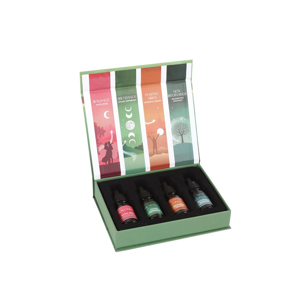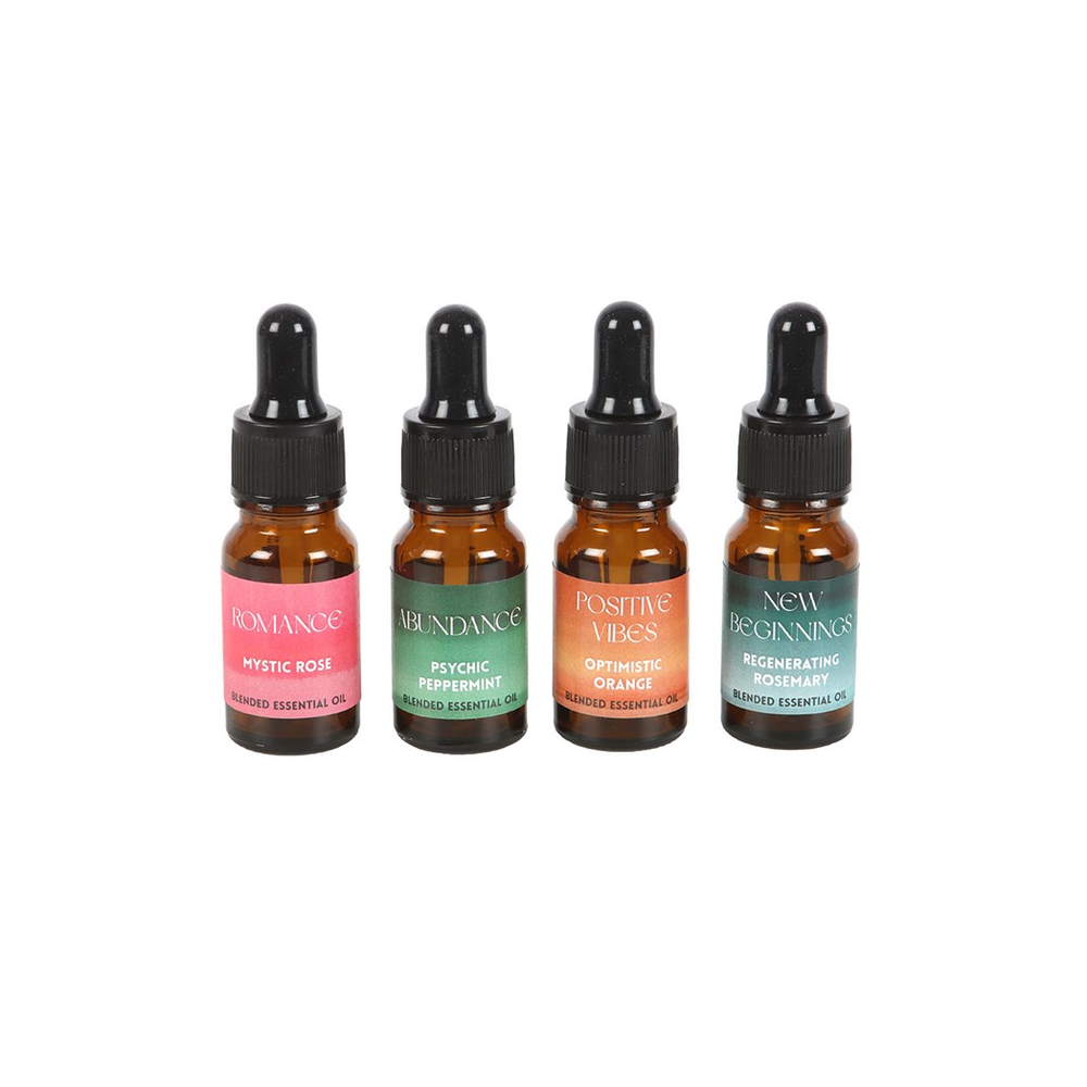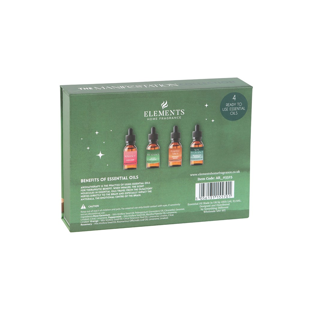 Focus your thoughts with this Manifestation collection of ready to use, blended essential oils. The set contains 4 x 10ml bottles with a dropper tool lid, helping to apply just the right amount of oil for each use. The scents you'll discover in this set are: Romance - Mystic Rose, Abundance - Psychic Peppermint, Positive Vibes - Optimistic Orange, New Beginnings - Regenerating Rosemary.